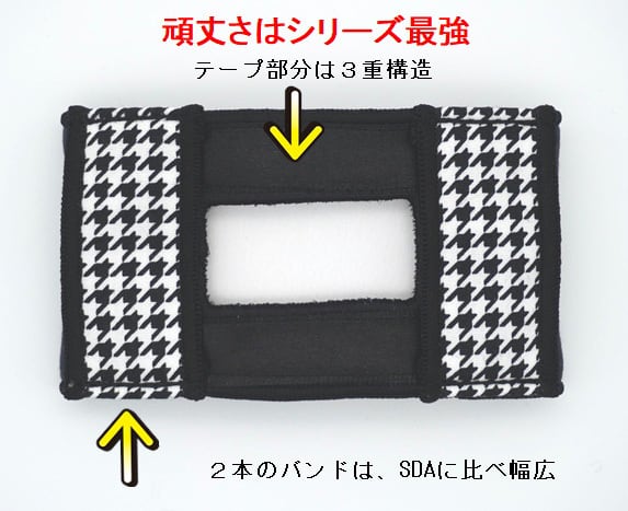 「モンスター」シリーズは、テープ部分が3重構造になり生地の張りと刺繍部分を強化。2か所の吊りバンドはSDAシリーズに比べ幅広にし強固に仕上げています。
