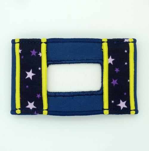 本品前面2か所のバンドは、「大小さまざまな星柄のプリント生地」「マイクロファイバー紺色」を2枚合わせにしています。
