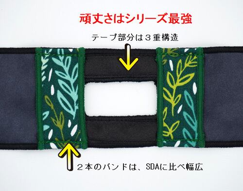 「モンスター」シリーズは、テープ部分が3重構造になり生地の張りと刺繍部分を強化。2か所の吊りバンドはSDAシリーズに比べ幅広にし強固に仕上げています。